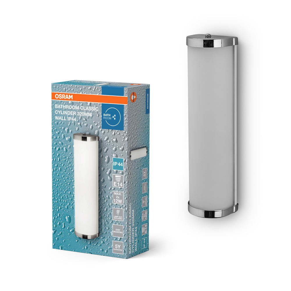 Die OSRAM CLASSIC CYLINDER Badezimmer-Wandleuchte 320mm, E14 ist eine elegante Zylinder-Wandleuchte für dein Badezimmer. Mit IP44-Schutz, einer hochwertigen Glasabdeckung und einem austauschbaren Leuchtmittel bietet sie zuverlässiges Licht in Feuchträumen – stilvoll und funktional.