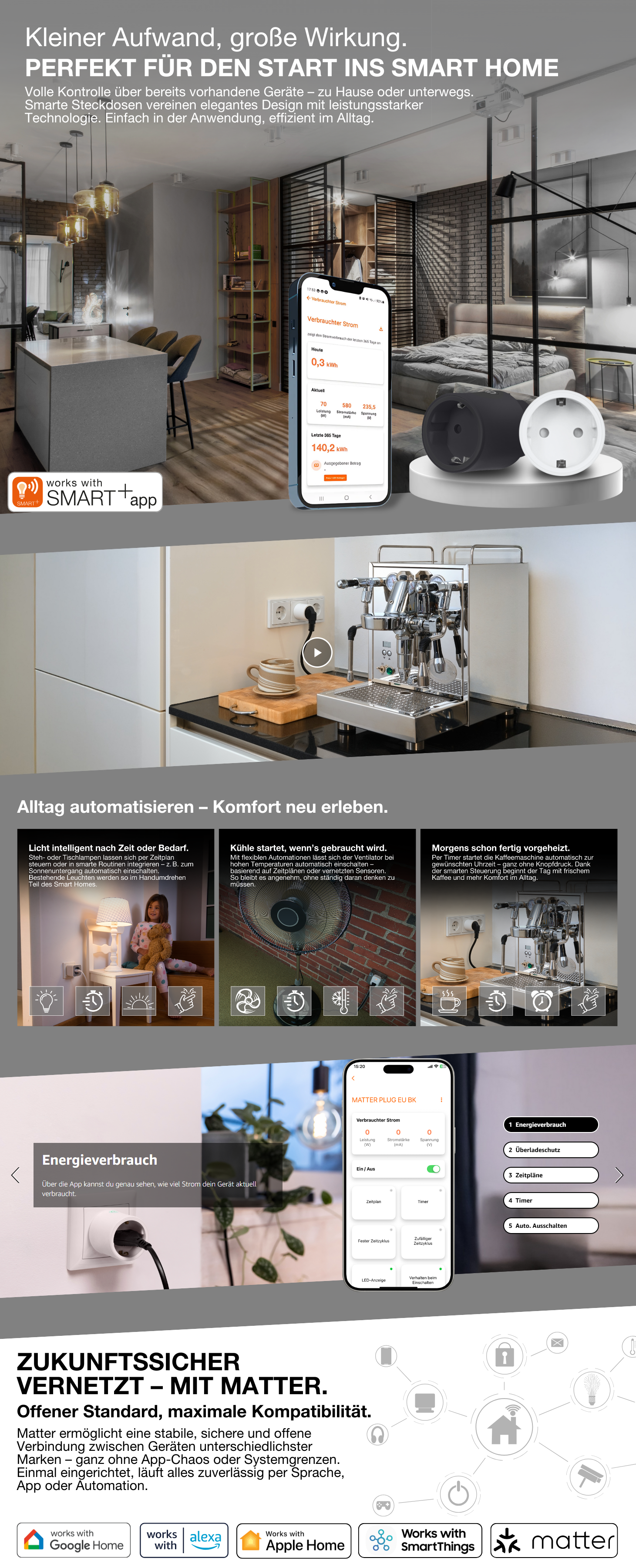 SMART+ WiFi Plug EU (für den Innenbereich) und SMART+ WiFi Compact Outdoor Plug EU (für den Außenbereich) – zwei vielseitige Lösungen, um nicht-smarte Geräte in Ihr Smart-Home-System zu integrieren. Mit dem SMART+ WiFi Plug EU (für den Innenbereich) und dem SMART+ WiFi Compact Outdoor Plug EU (für den Außenbereich) können Sie nicht-smarte Geräte nahtlos in Ihr Smart-Home-System integrieren, sie fernsteuern und den Energieverbrauch überwachen.