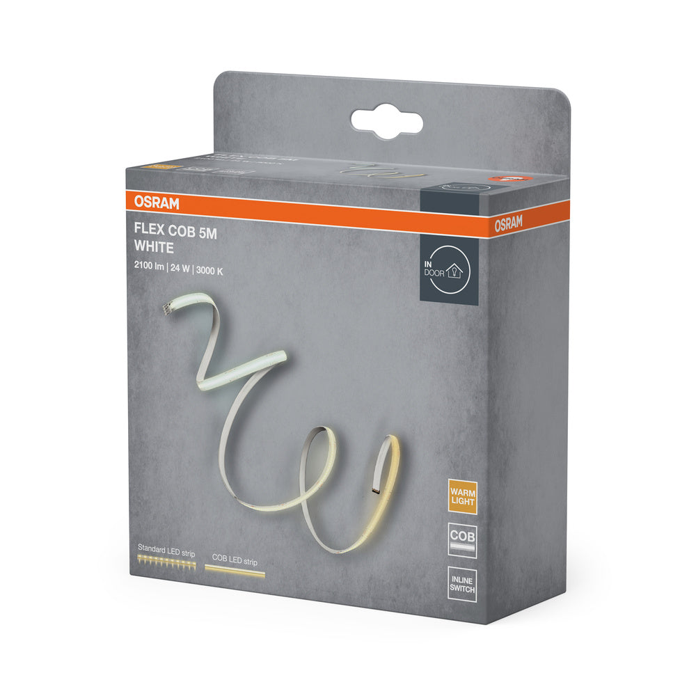 Dekorative COB Strips mit warmweißem Licht und homogener Lichtwirkung. Produkteigenschaften: COB Technologie für homogene Lichtverteilung. Lichtfarbe: Warm Weiß. Flexible, biegsame LED-Lichtstreifen. Produktvorteile: Einfache und schnelle Installation. Gleichmäßige Lichtverteilung dank COB LED. Anwendungsgebiete: Wohnräume. Indirekte Beleuchtung. Technische Ausstattung: Vollständiges Montage- und Anschlusszubehör enthalten.