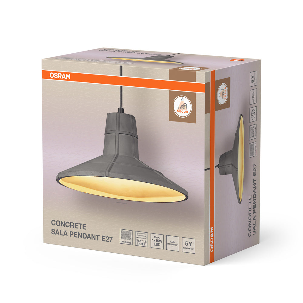 Die OSRAM Decor Concrete Sala Pendelleuchte ist eine moderne Beton-Deckenlampe mit E27-Fassung für Innenräume. Sie verbindet urbanen Industriestil mit flexibler Lampenwahl und passt perfekt in Flure, Eingangsbereiche, Treppenhäuser, Wohnzimmer und Kellerräume.