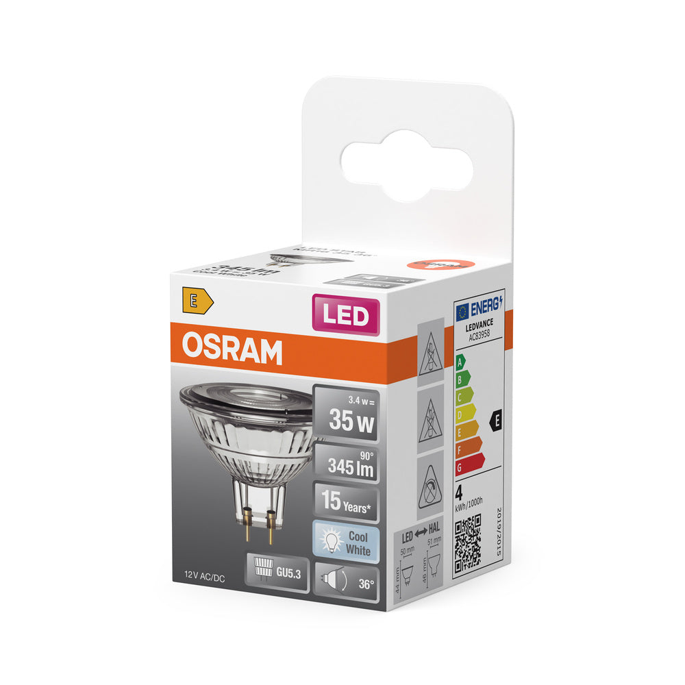 OSRAM  LED STAR MR16 12V LED Reflektorlampe mit GU5.3 Sockel, Kaltweiss (4000K), Glas Spot, 3,80W, Ersatz für 35W-Reflektorlampe