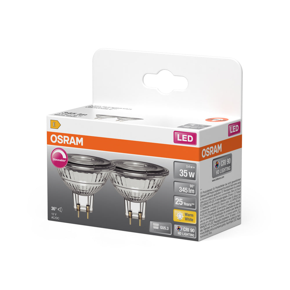 OSRAM Dimmbare Niedervolt-LED-Reflektorlampen MR16 mit Retrofit-Stecksockel, 35 Watts Ersatz, GU5.3, MR16 reflector, 2700 Kelvin, Warm weiß, Klares Glas, 2-er Pack