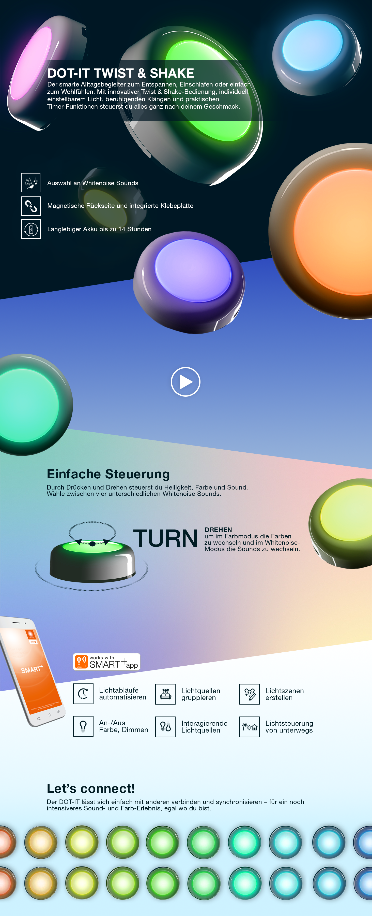 Der OSRAM DOT-IT TWIST & SHAKE ist eine kompakte, wiederaufladbare Lichtquelle mit integrierter White Noise-Funktion – ideal für entspannte Abende, Schlafrituale und stimmungsvolle Beleuchtung in jedem Raum. Im praktischen 3er-Variante-Paket erhältst du drei identische Leuchten, die sich flexibel einsetzen lassen und nahtlos in dein Zuhause integrieren.