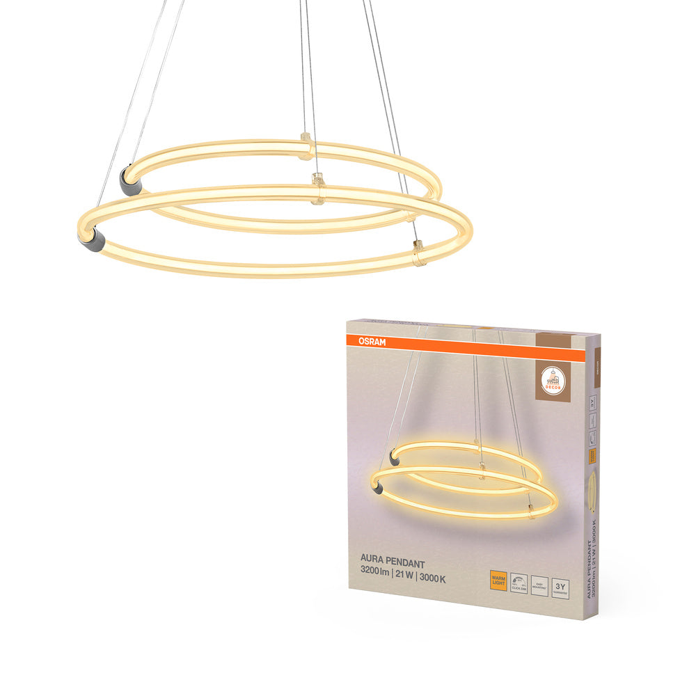 Die OSRAM DECOR Aura ist eine elegante 2er-Variante Pendelleuchte mit integriertem LED‑Filament-Design in warmweißem Licht (3000K). Sie passt sich mit ihrem minimalistischen Stil jedem Raum an und sorgt für eine harmonische Lichtstimmung in Flur, Eingangsbereich, Treppenhaus oder Wohnzimmer.