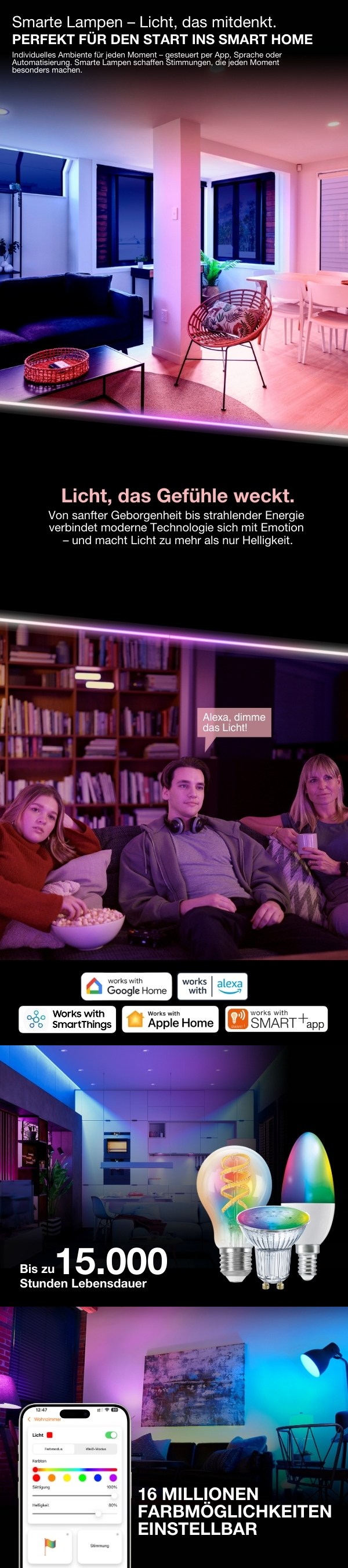 Sprachsteuerung: Funktioniert mit Amazon Alexa, Google Assistant und Apple Home – für bequemes, freihändiges Lichtmanagement